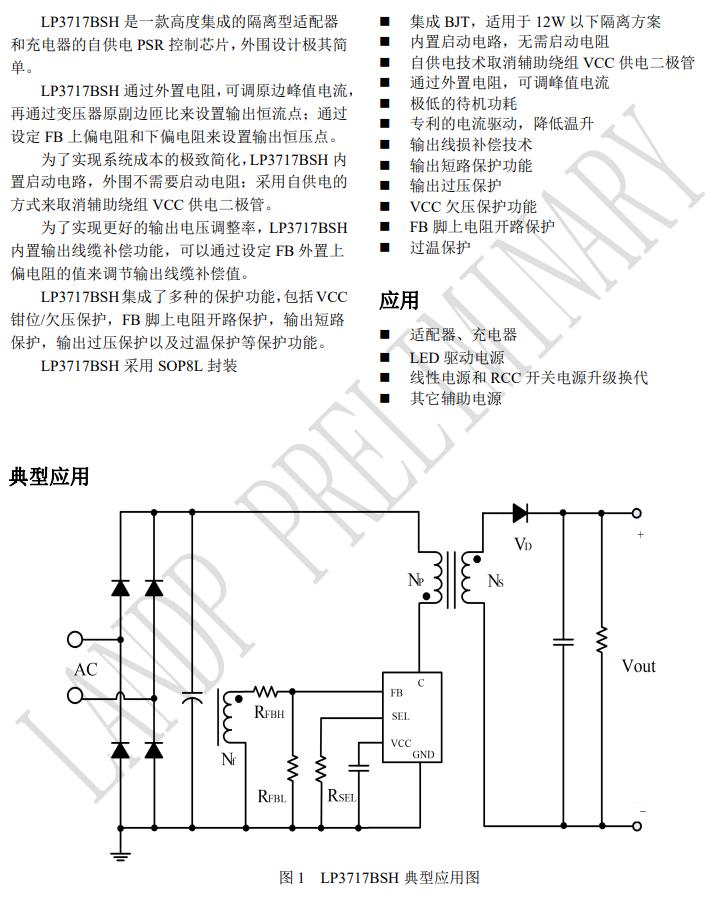 LP3717 是一款高度集成的隔離型適配器和充 電器的自供電 PSR 控制芯片,外圍設計極其簡單。
