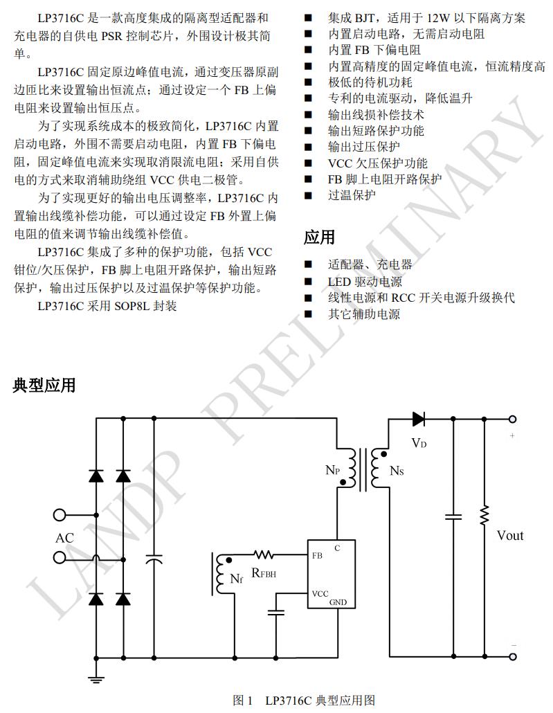LP3716 是一款高度集成的隔離型適配器和 充電器的自供電 PSR 控制芯片,外圍設計極其簡 單。