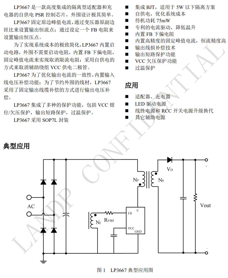 LP3667 是一款高度集成的隔離型適配器和充 電器的自供電 PSR 控制芯片,外圍設計極其簡單。