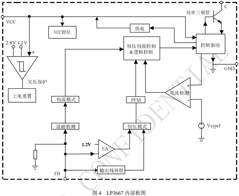 LP3667 固定原邊峰值電流,通過變壓器原副邊 匝比來設置輸出恒流點;通過設定一個 FB 電阻來 設置輸出恒壓點。 為了實現系統成本的極致簡化,LP3667 內置啟 動電路,外圍不需要啟動電阻,內置 FB 下偏電阻, 固定峰值電流來實現取消限流電阻;采用自供電的 方式來取消輔助繞組 VCC 供電二極管。