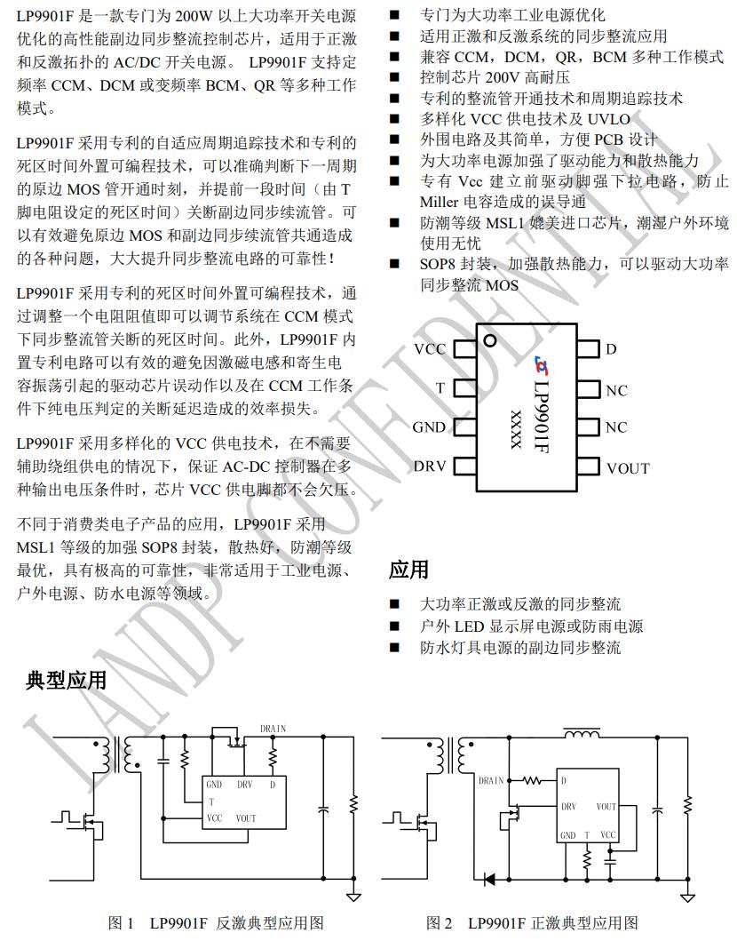 LP9901 支持定 頻率 CCM、DCM 或變頻率 BCM、QR 等多種工作 模式。 LP9901F 采用專利的自適應周期追蹤技術和專利的 死區(qū)時間外置可編程技術,可以準確判斷下一周期 的原邊 MOS 管開通時刻,并提前一段時間(由 T 腳電阻設定的死區(qū)時間)關斷副邊同步續(xù)流管。