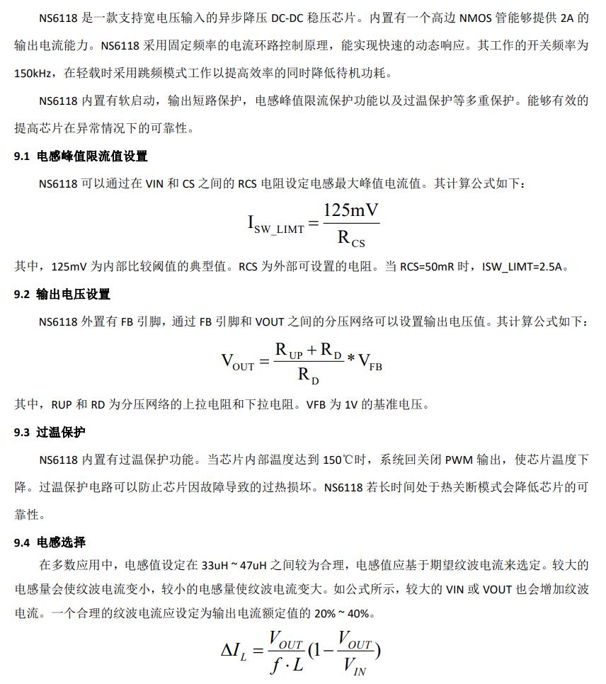 NS6118 是一款支持寬電壓輸入的異步降壓 DC-DC 穩壓芯片。內置有一個高邊 NMOS 管能夠提 供 2A 的輸出電流能力。NS6118 采用電流模式的環 路控制原理,實現了快速的動態響應。芯片還集成 有過溫保護,輸出短路保護和輸入欠壓保護等多重 保護功能。