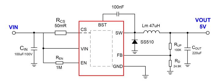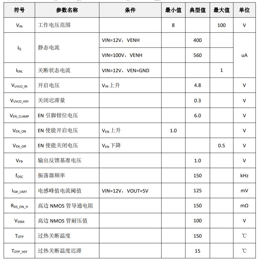 特性 ? 寬輸入電壓范圍:8V-100V ? 最大 2A 輸出電流 ? 電感最大峰值電流可調節 ? 低待機功耗 ? 外置 FB 引腳,輸出電壓可調節 ? 支持 EN 使能控制 ? 異步降壓開關頻率 150KHz ? 內置軟啟動 ? 內置過溫保護、輸出短路保護 ? 封裝形式 ESOP8