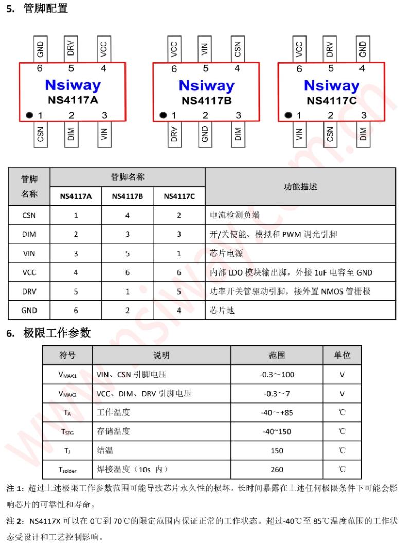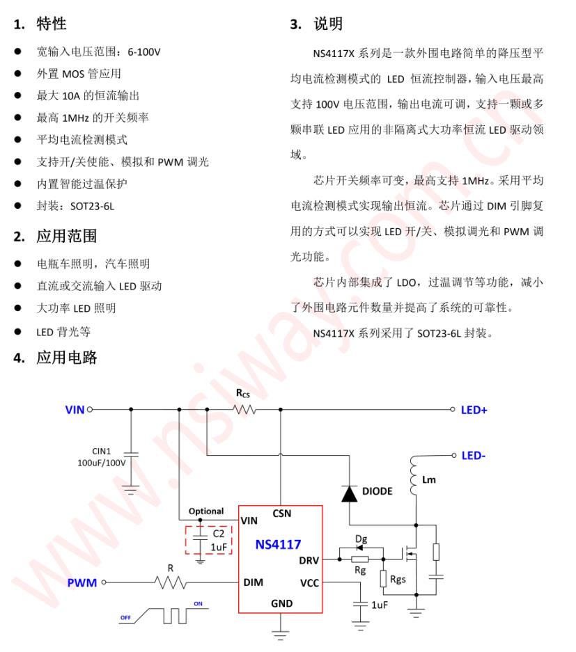 NS4117X系列是一款外圍電路簡單的降壓型平均電流檢測模式的LED恒流控制器,輸入電壓最高支持100V電壓范圍,輸出電流可調,支持一顆或多顆串聯LED應用的非隔離式大功率恒流LED驅動領域。芯片開關頻率可變,最高支持1MHz。采用平均電流檢測模式實現輸出恒流。芯片通過DIM引腳復用的方式可以實現LED開/關、模擬調光和PWM調光功能。芯片內部集成了LDO,過溫調節等功能,減小了外圍電路元件數量并提高了系統的可靠性。NS4117X系列采用了SOT23-6L封裝。