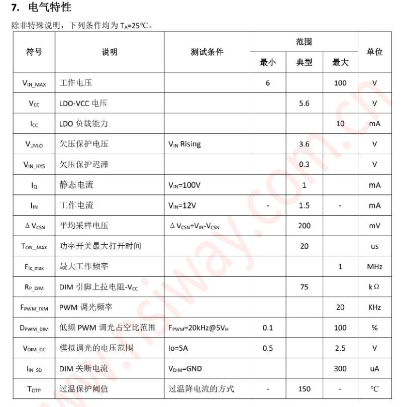 特性寬輸入電壓范圍:6-100V 外置 Mos管應用 最大10A的恒流輸出 最高1MHz的開關頻率 平均電流檢測模式支持開/關使能、模擬和PWM調光內置智能 過溫保護