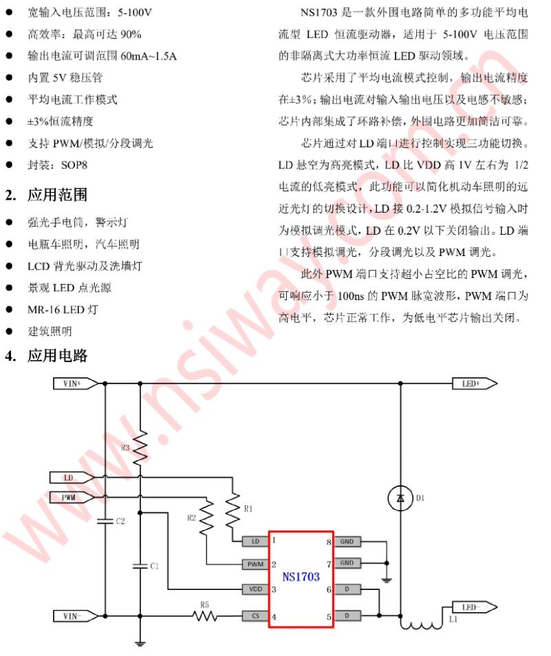 NS1703 1.5A 100V輸出多功能平均電流型LED恒流驅動器