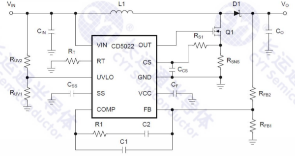 CD5022 國產PWM控制驅動器 完美替代TI/LM5022,是一款適用于Boost和SEPIC穩(wěn)壓器的高壓、低側、N溝道MOSFET控制器。該器件包含實施單端主要拓撲所需的全部特性。輸出電壓調節(jié)基于電流模式控制,這不僅簡化了環(huán)路補償?shù)脑O計,同時還能夠提供固有輸入電壓前饋。包含一個啟動穩(wěn)壓器,該穩(wěn)壓器能夠在6V至60V的寬輸入范圍內工作。PWM控制器專為高速性能而設計,包含一個振蕩器,振蕩器頻率范圍高達2.2MHz,總傳播延遲低于100ns。其它功能還包括誤差放大器、精密基準、線路欠壓鎖定、逐周期電流限制、斜率補償、軟啟動、外部同步功能和熱關斷。6V至60V寬輸入電壓、電流模式升壓、SEPIC 和反激式控制器;適用于Boost和SEPIC穩(wěn)壓器的高壓、低側、N溝道MOSFET控制器,該器件包含實施單端主要拓撲所需的全部特性。