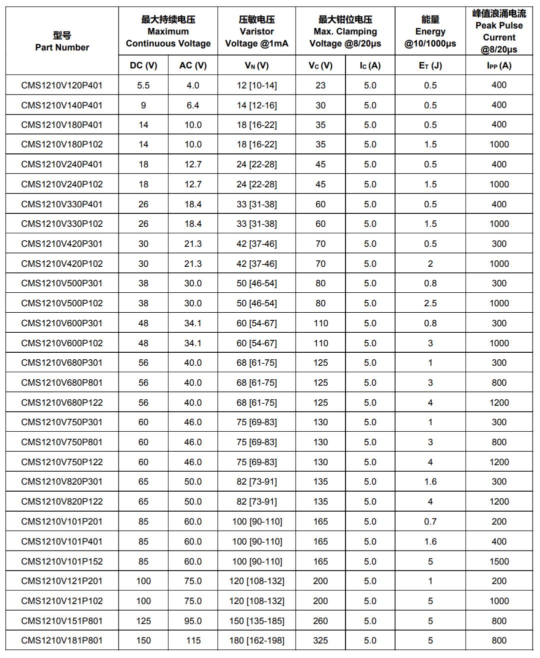 The CMS-P Series is specially designed for AC power-lines protection applications. It features a very high current  protection capability with a very small size, also a very fast response thus a ultra low clamping voltage. These  characteristics make CMS-P Series devices the best replacement of TVS and improvement of metal oxide (MOV) in  high working voltage applications.