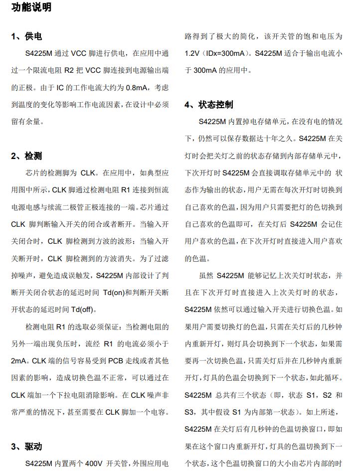 S4225M是帶狀態記憶功能的開關調色溫控制芯片,內部設定狀態切換窗口時間Tsw(典型值64S)關燈時間超過狀態切換窗口時間芯片會記住關燈前的狀態,下次開燈時直接呈現關燈前的狀態;關燈時間小于狀態切換窗口時間開燈則切換到下一個色溫狀態,增加了使用的便利性。 S4225M通過檢測脈沖信號來判斷開關機狀態,確保多個電源同時應用時的邏輯一致性,而且可以兼容 Flyback、Buck-Boost、Buck及線性等多種 LED 驅動方案。