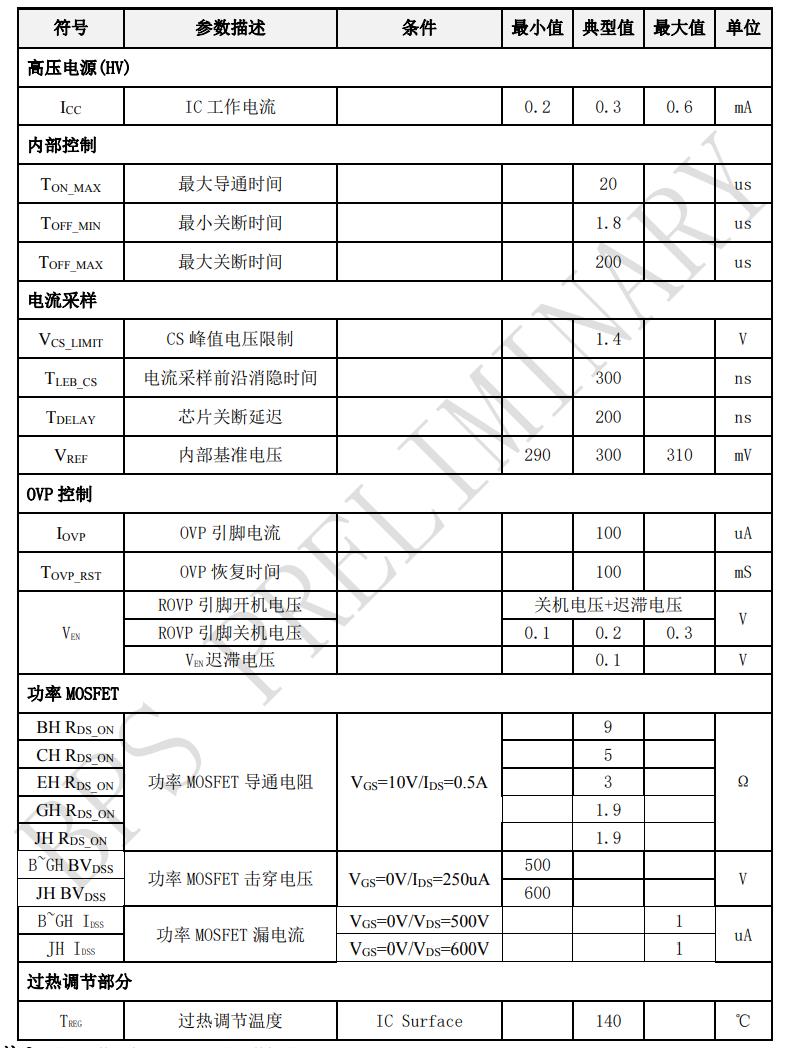 | 產(chǎn)品型號(hào) | 封裝 | 無(wú)VCC 無(wú)COMP | MOS內(nèi)阻 | MOS耐壓 | 開路保護(hù) | 內(nèi)置CS電阻 | 內(nèi)置 續(xù)流二極管 | 內(nèi)置橋堆 | 輸出電流@Vout=72V(mA) (Vin=176V-265V) |