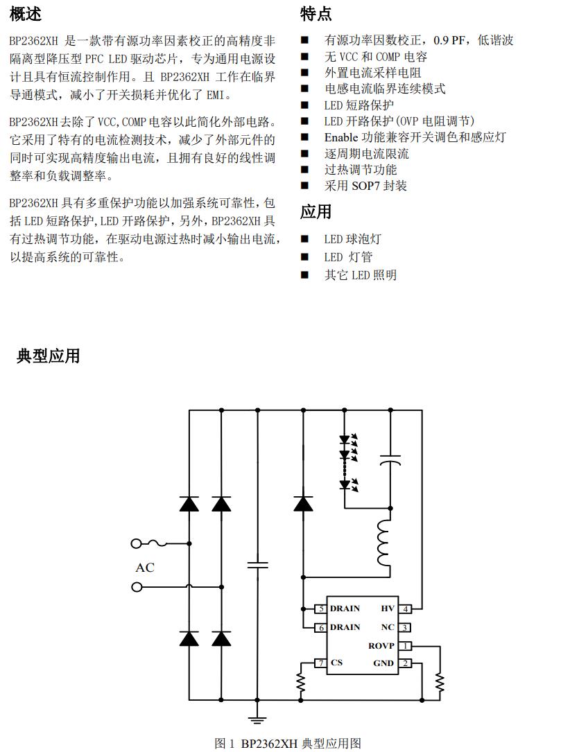 BP2362XH 是一款帶有源功率因素校正的高精度非 隔離型降壓型 PFC LED 驅(qū)動(dòng)芯片,專為通用電源設(shè) 計(jì)且具有恒流控制作用。且 BP2362XH 工作在臨界 導(dǎo)通模式,減小了開關(guān)損耗并優(yōu)化了 EMI。