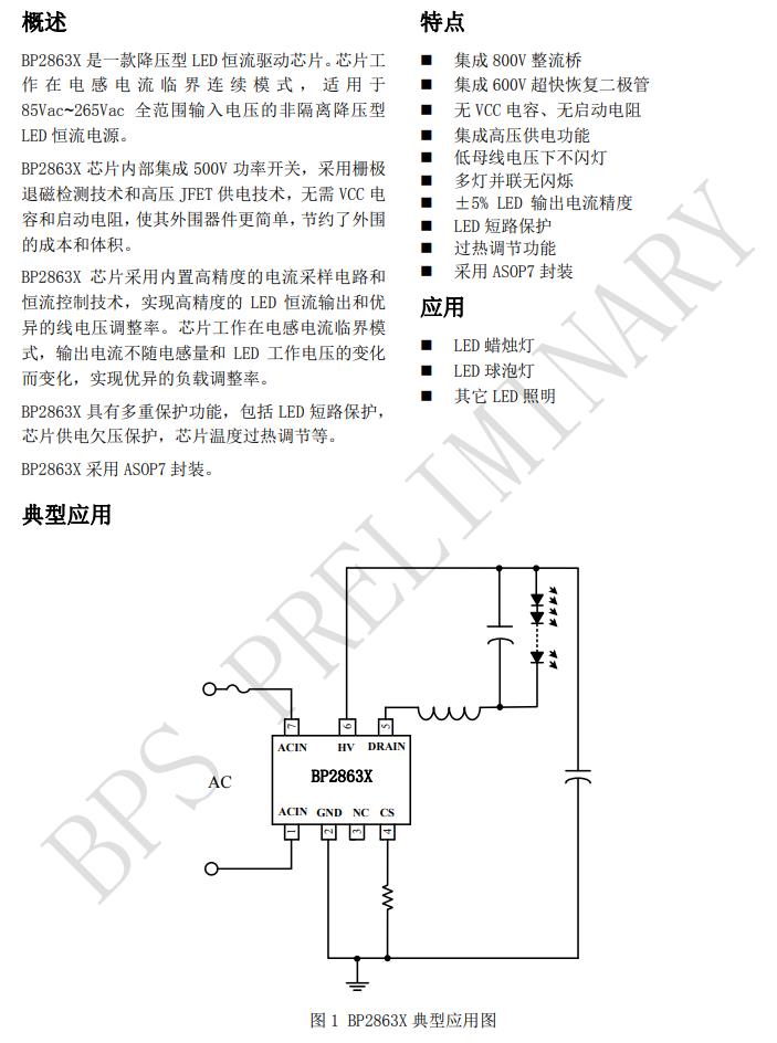 BP2863X 芯片采用內(nèi)置高精度的電流采樣電路和 恒流控制技術(shù),實(shí)現(xiàn)高精度的 LED 恒流輸出和優(yōu) 異的線電壓調(diào)整率。芯片工作在電感電流臨界模 式,輸出電流不隨電感量和 LED 工作電壓的變化 而變化,實(shí)現(xiàn)優(yōu)異的負(fù)載調(diào)整率。 BP2863X 具有多重保護(hù)功能,包括 LED 短路保護(hù), 芯片供電欠壓保護(hù),芯片溫度過(guò)熱調(diào)節(jié)等。 BP2863X 采用 ASOP7 封裝。
