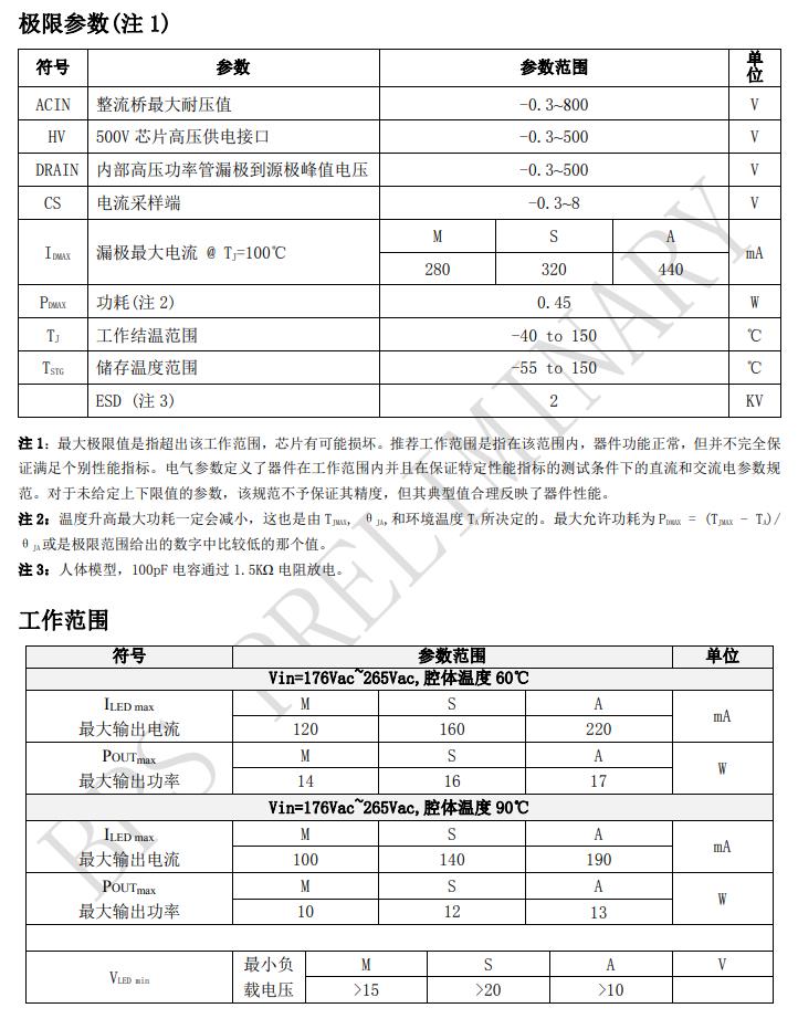 | 產(chǎn)品型號(hào) | 封裝 | MOS內(nèi)阻 | MOS耐壓 | 過(guò)溫 保護(hù) | 開路保護(hù) | 輸出電流@Vout=72V(mA) (Vin=176V-265V) | 最大輸出功率(W) (Vin=176V-265V) |