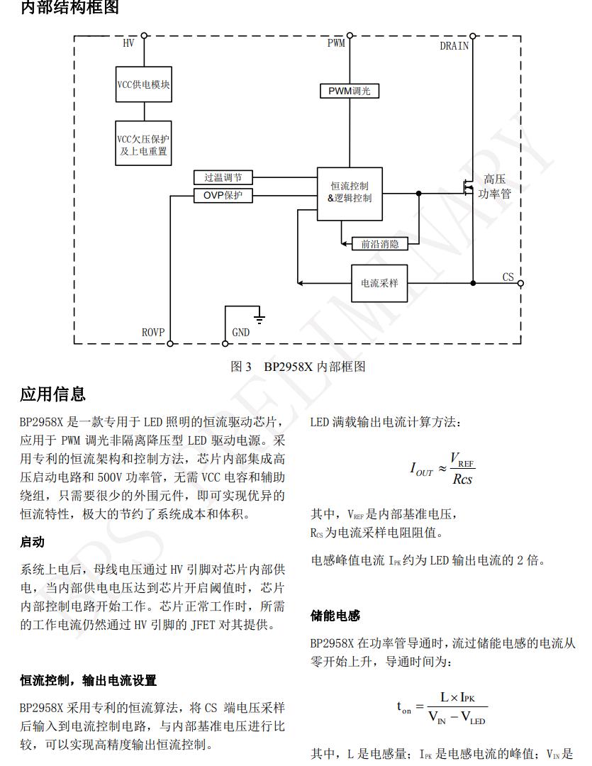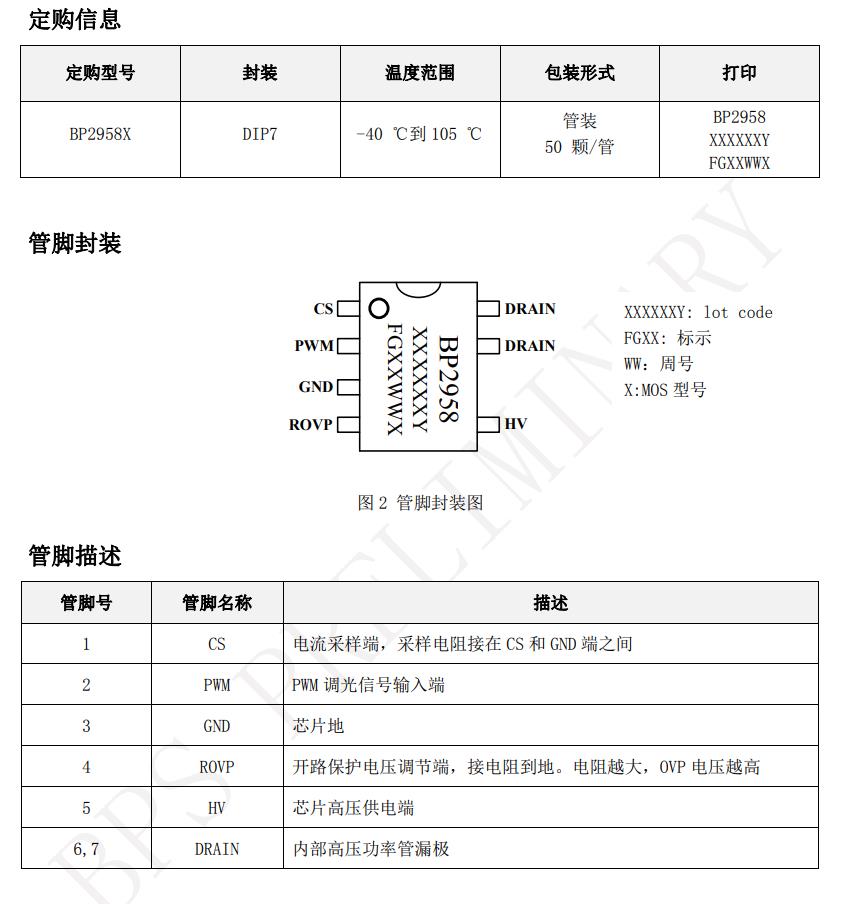 BP2958X芯片內部帶有高精度的電流采樣電路,來實現精確的 LED 恒流輸出和優異的線電壓調整率。BP2958X具有多重保護功能,包括LED開路保護,LED短路保護,芯片溫度過熱調節等。