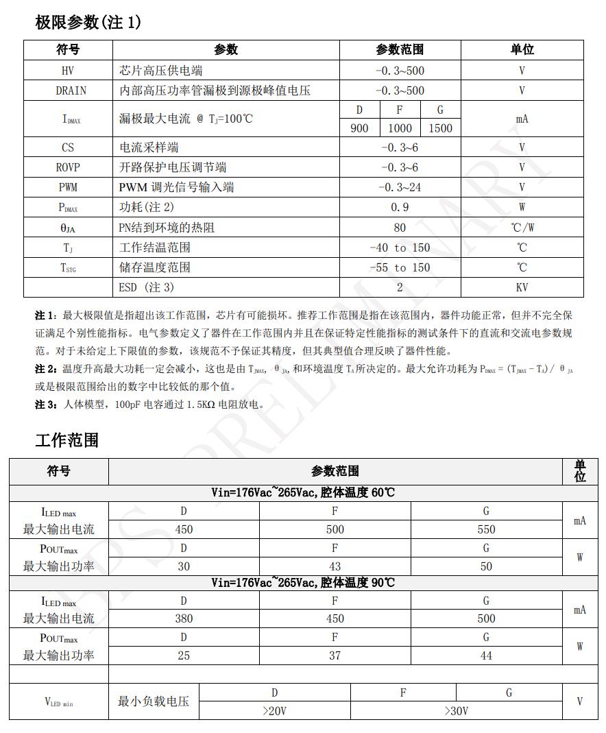 優勢 支持 1%6-100%PWM 調光 全程模擬調光無頻閃 無需啟動電阻和 VCC 電容 內部集成500V功率管 ±5% LED 輸出電流精度 LED 開路保護 LED 短路保護