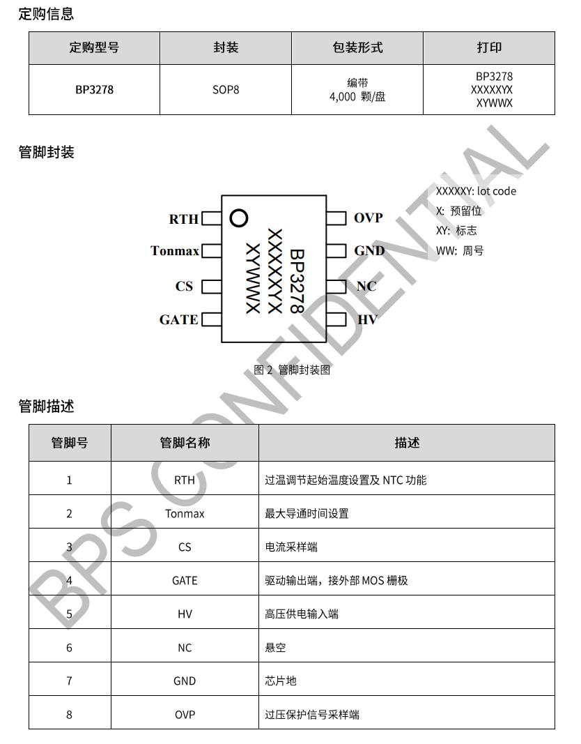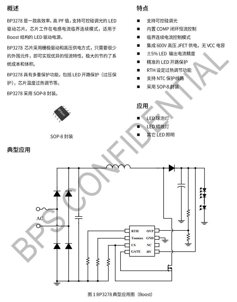 BP3278具有多重保護功能,包括LED 開路保護 (過壓保護),芯片溫度過熱調(diào)節(jié)等。BP3278 采用 SOP-8 封裝。