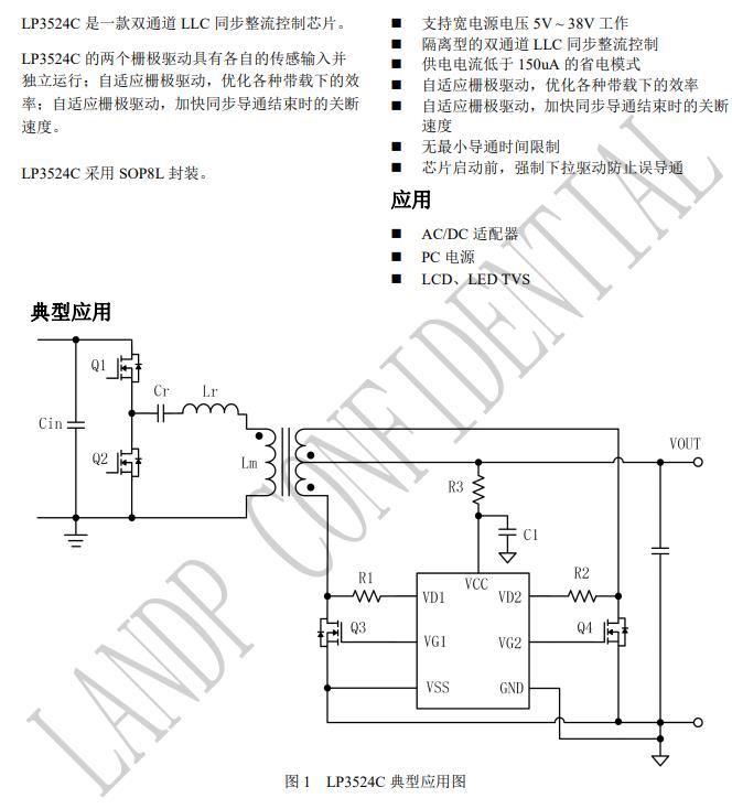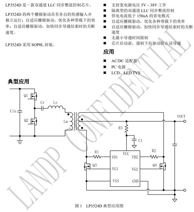 LP3524B 是一款具有極快關(guān)斷速度的雙通道 LLC 同步整流控制芯片。 LP3524B 驅(qū)動(dòng)兩路 NMOS,且采用特有的 VDS電壓 調(diào)節(jié)技術(shù),可以達(dá)到極快的關(guān)斷速度,兼容 DCM、 CCM 和 QR 工作模式。