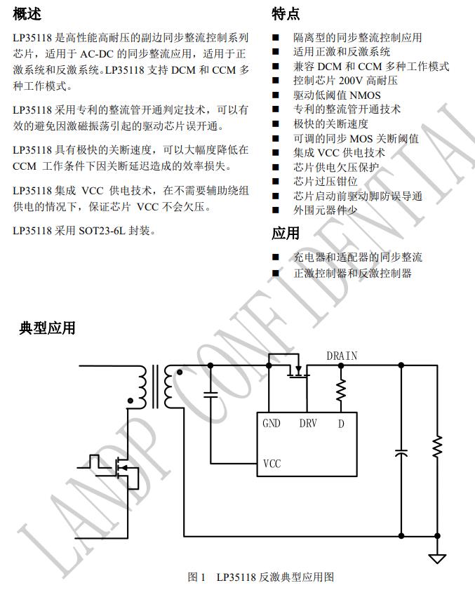 LP35118 采用專利的整流管開通判定技術,可以有 效的避免因激磁振蕩引起的驅動芯片誤開通。 LP35118 具有極快的關斷速度,可以大幅度降低在 CCM 工作條件下因關斷延遲造成的效率損失。