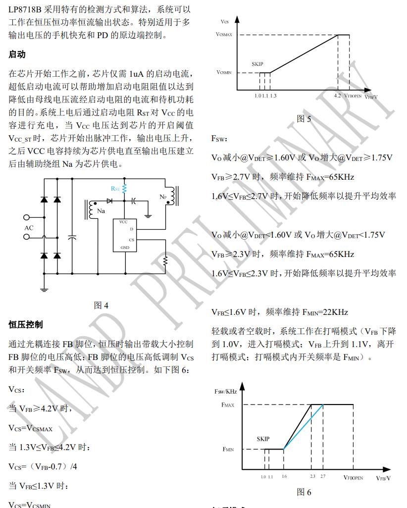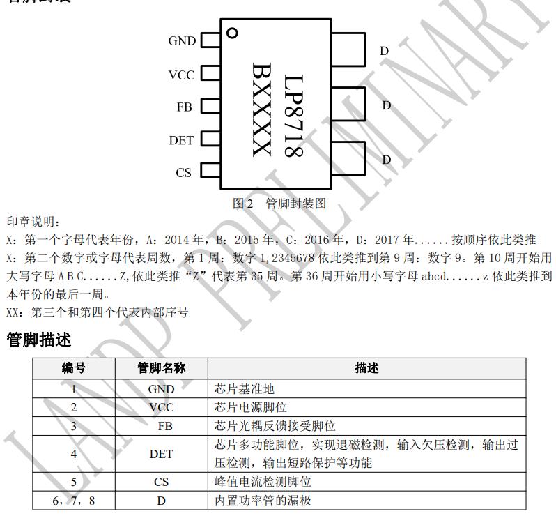 LP8718B 是一款適合于副邊控制反激應用的恒壓 恒功率恒流驅動芯片。 LP8718B 內部集成 650V 高壓功率管,采用特有的 檢測方式和算法,系統可以工作在恒壓、恒功率以 及恒流輸出狀態。 在恒壓工作狀態時,芯片采用峰值電流控制模式, 并且在中載以下開始降低頻率以提升平均效率,在 輕載或者空載時,系統工作在打嗝模式; 在恒功率、恒流工作狀態時, 芯片通過 DET 腳位 電壓推算出輸出電壓和退磁點,根據不同的系統輸 出電壓來設定不同的輸出電流限流值來實現高輸 出電壓恒功率和低輸出電壓恒流特性。 芯片采用特有的頻率抖動技術來改善 EMI 指標。