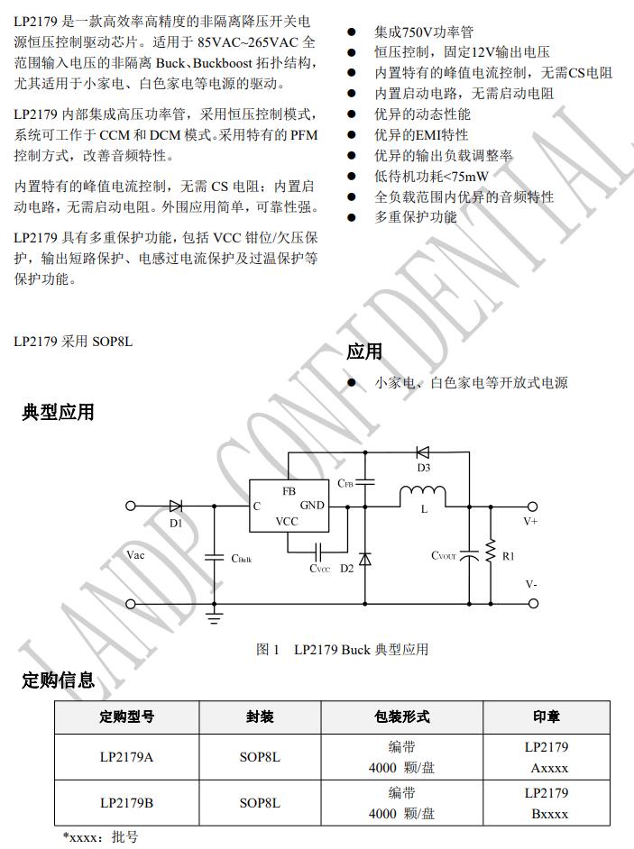 LP2179 是一款高效率高精度的非隔離降壓開關電 源恒壓控制驅動芯片。適用于 85VAC~265VAC 全 范圍輸入電壓的非隔離 Buck、Buckboost 拓撲結構, 尤其適用于小家電、白色家電等電源的驅動。