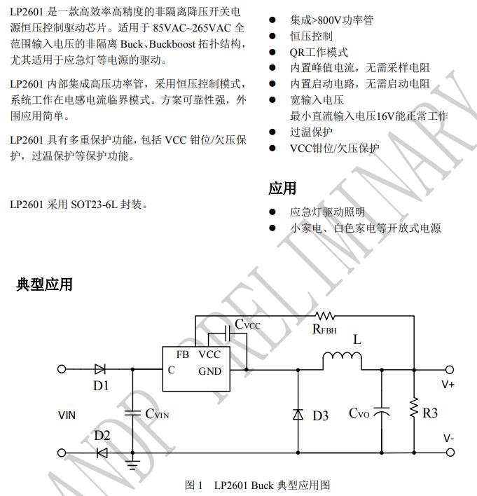 LP2601 是一款高效率高精度的非隔離降壓開關電 源恒壓控制驅動芯片。適用于 85VAC~265VAC 全 范圍輸入電壓的非隔離 Buck、Buckboost 拓撲結構, 尤其適用于應急燈等電源的驅動。