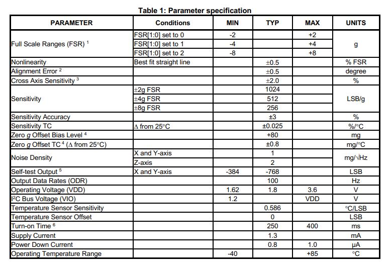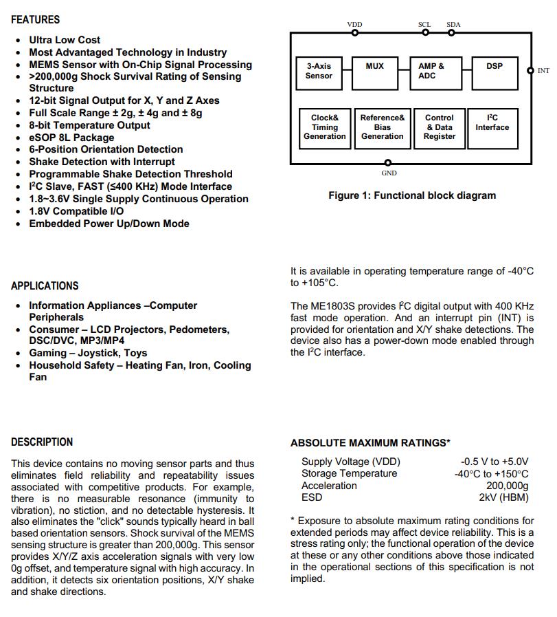 可承受超過200,000g沖擊的傳感器結構 X/Y/Z三軸12位數字信號輸出 量程±2g, ±4g 和 ±8g可選 6個方向位置偵測 I2C從動,快速模式 (≤400 KHz) 1.8~3.6V單電源連續運行 兼容1.8V電平 符合RoHS標準