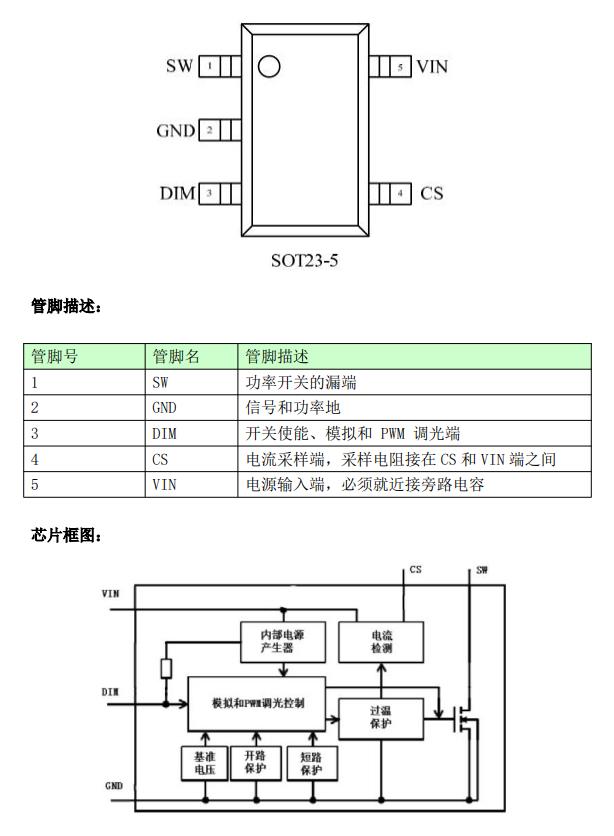 ? 極少的外部元件 ? 5V 到 30V 的電壓輸入范圍 ? ±3%的輸出電流精度 ? LED 開路保護 ? LED 短路保護 ? 過溫保護 ? 最大輸出電流 1.2A ? 復用 DIM 模擬調光 ? 復用 DIMPWM 調光 ? 高達 97%的效率 ? 輸出可調的橫流控制方法
