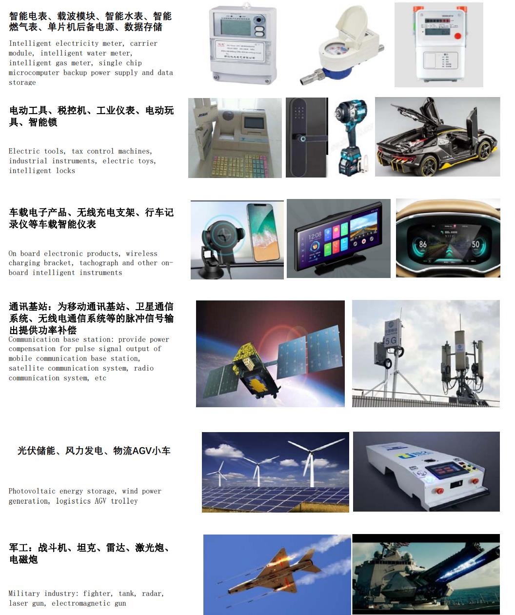 wide applicable temperature range:- 40 ℃~85 ℃ customized monomers and modules of various sizescustomize various monomers with high temperature resistance, highvoltage resistance, ultra-low ESR, ultra-low self discharge and ultra long service life.provide complete system solutions