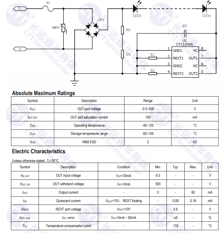 CYT1000A is a linear constant current IC with adjustable outputcurrent, high constant-current accuracy, simple applicationscheme. Cost and Resistance capacitance step-down arecomparable, with over-temperature protection function, safer andmore reliable.