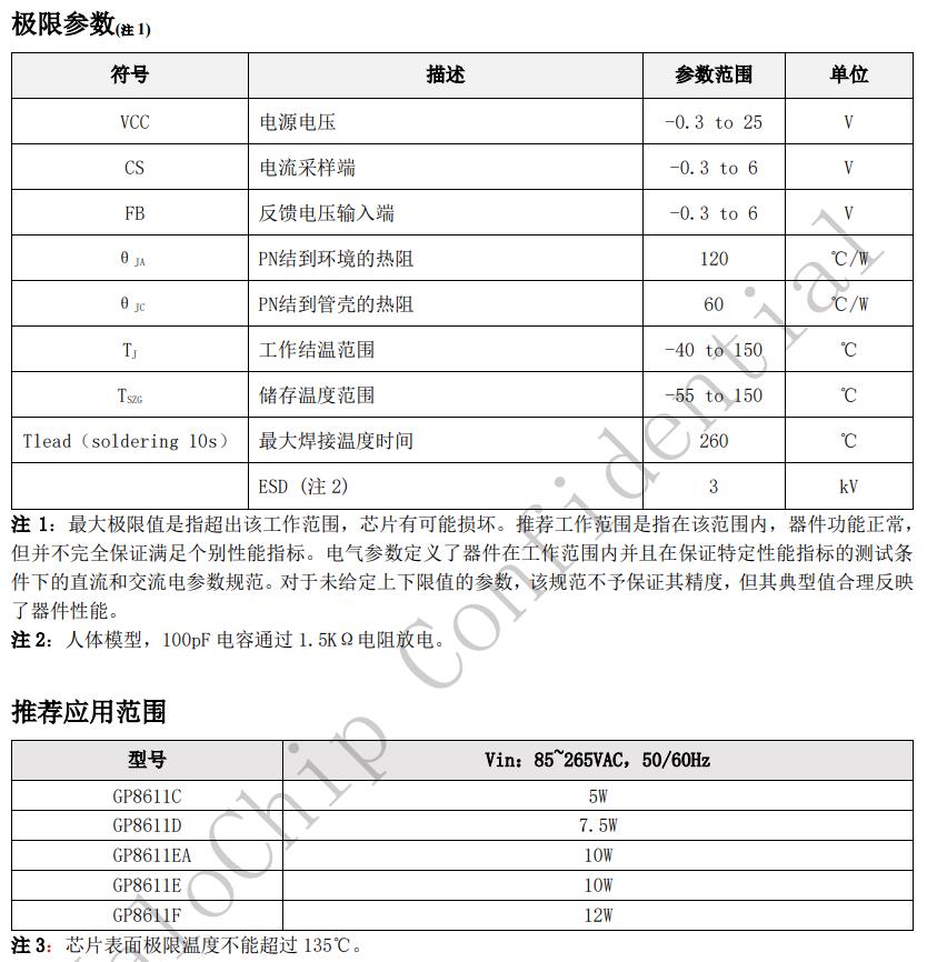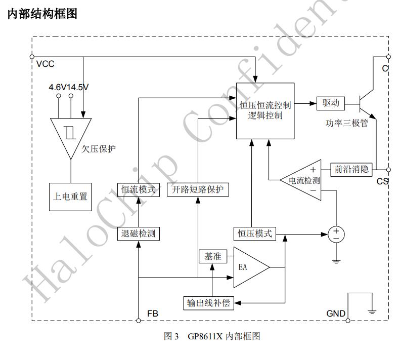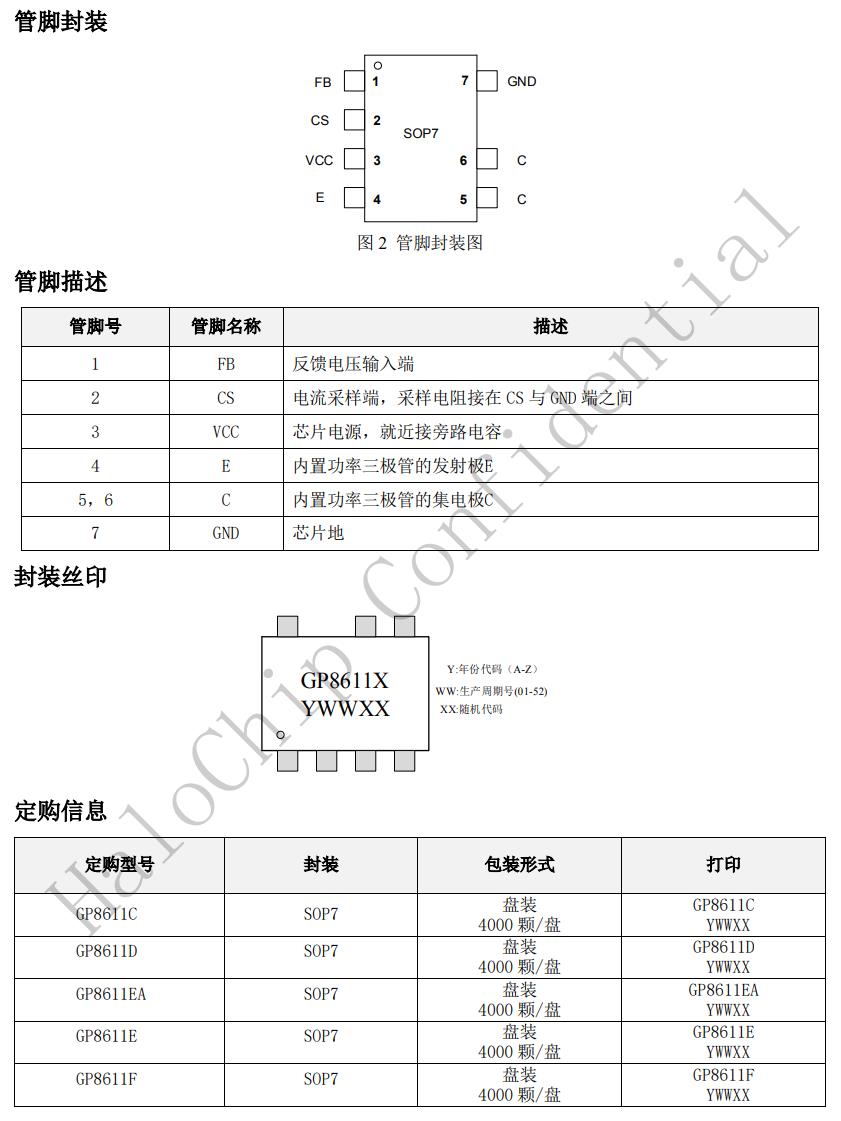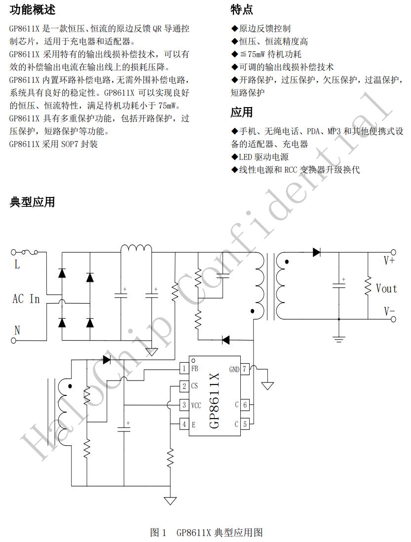 GP8611X內置環路補償電路,無需外圍補償電路,系統具有良好的穩定性。GP8611X可以實現良好的恒壓、恒流特性,滿足待機功耗小于75mW。GP8611X具有多重保護功能,包括開路保護,過壓保護,短路保護等功能。GP8611X采用SOP7封裝