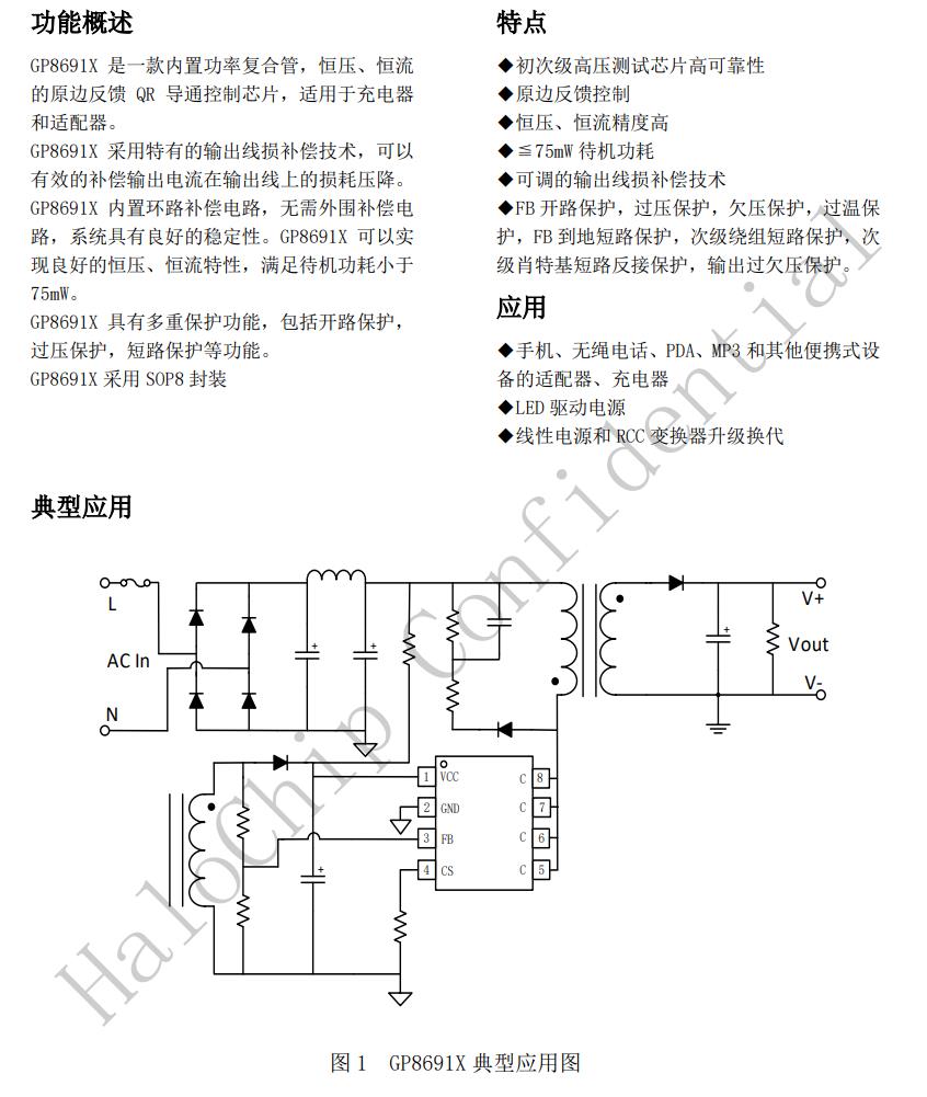 GP8691X是一款內(nèi)置功率復(fù)合管,恒壓、恒流的原邊反饋QR導(dǎo)通控制芯片,適用于充電器和適配器。GP8691X采用特有的輸出線損補(bǔ)償技術(shù),可以有效的補(bǔ)償輸出電流在輸出線上的損耗壓降。