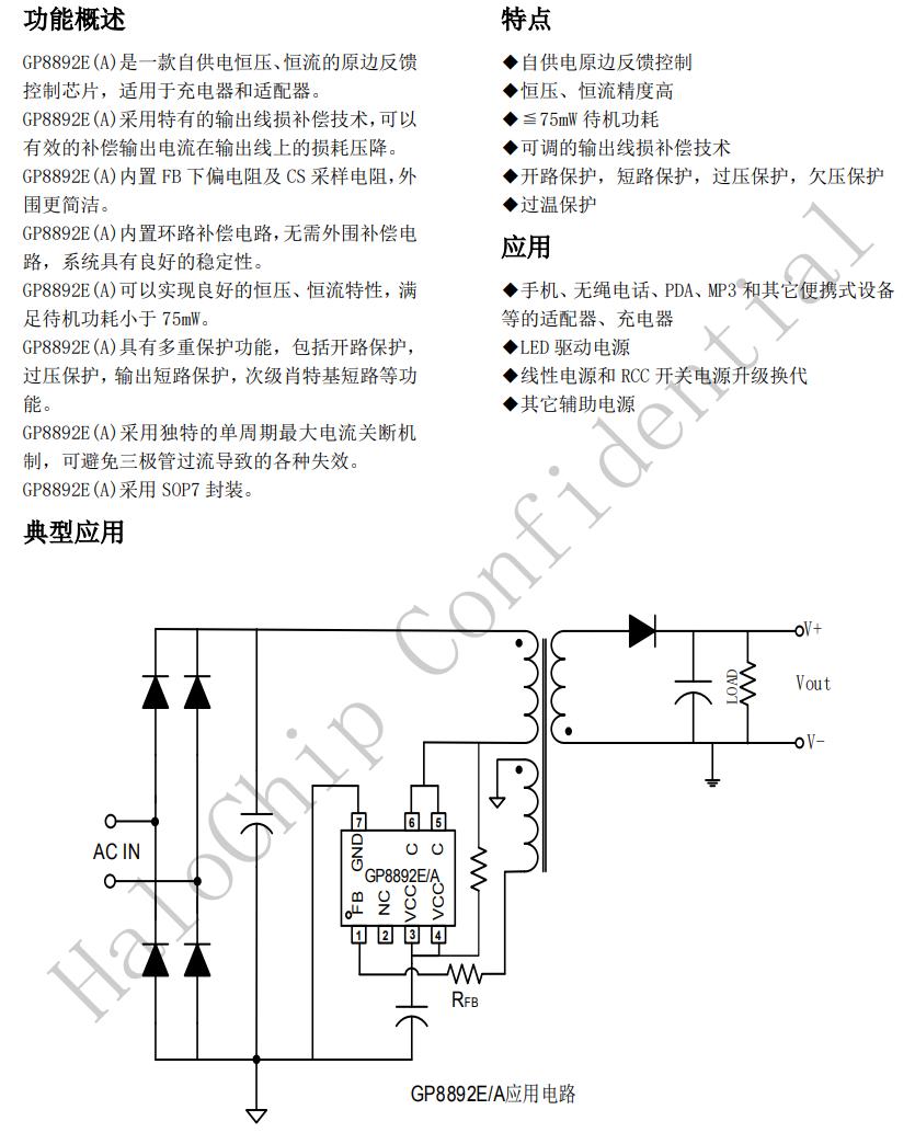 GP8892E(A)是一款自供電恒壓、恒流的原邊反饋控制芯片,適用于充電器和適配器。GP8892E(A)采用特有的輸出線損補償技術(shù),可以有效的補償輸出電流在輸出線上的損耗壓降。