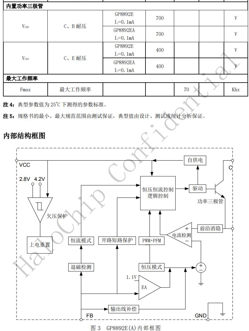 GP8892E(A)具有多重保護(hù)功能,包括開路保護(hù),過壓保護(hù),輸出短路保護(hù),次級肖特基短路等功能。GP8892E(A)采用獨特的單周期最大電流關(guān)斷機制,可避免三極管過流導(dǎo)致的各種失效。