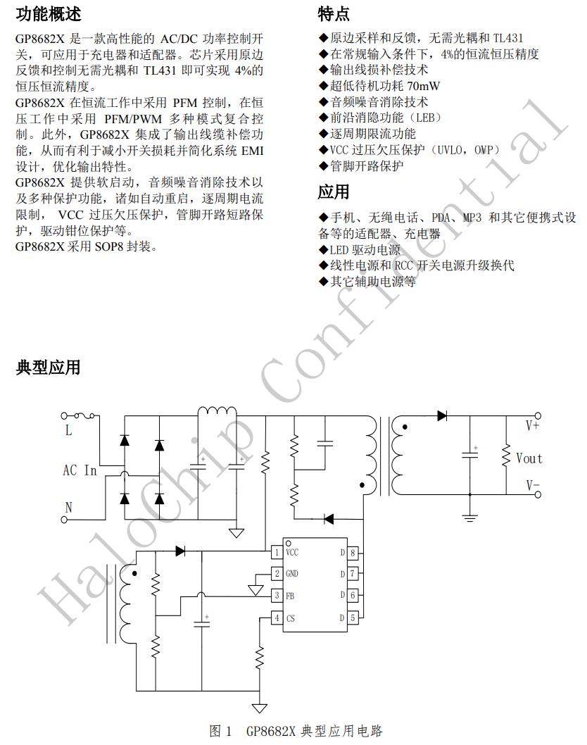 GP8682X是一款高性能的AC/DC功率控制開關,可應用于充電器和適配器。芯片采用原邊反饋和控制無需光耦和TL431即可實現(xiàn)4%的恒壓恒流精度。