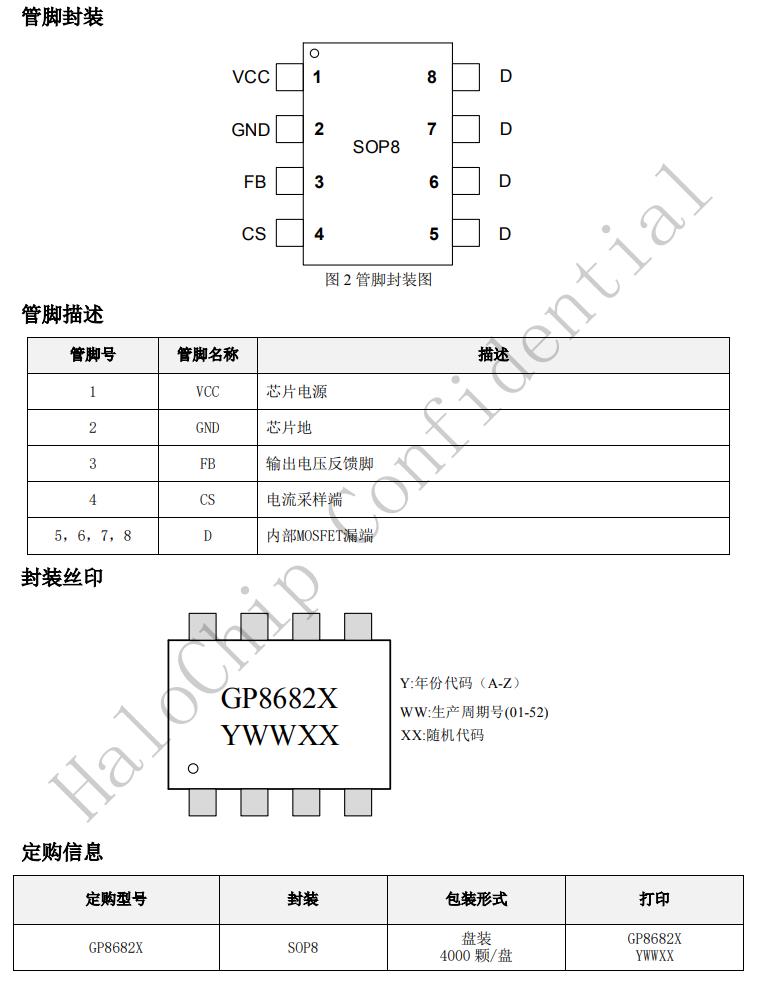 GP8682X提供軟啟動,音頻噪音消除技術以及多種保護功能,諸如自動重啟,逐周期電流限制,VCC過壓欠壓保護,管腳開路短路保護,驅動鉗位保護等。GP8682X采用SOP8封裝。
