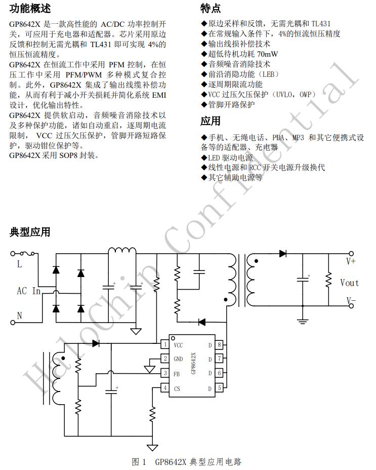 GP8642X是一款高性能的AC/DC功率控制開關(guān),可應(yīng)用于充電器和適配器。芯片采用原邊反饋和控制無需光耦和TL431即可實現(xiàn)4%的恒壓恒流精度。