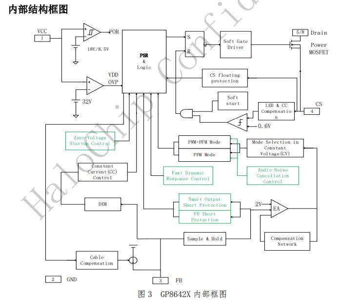 GP8642X提供軟啟動,音頻噪音消除技術(shù)以及多種保護功能,諸如自動重啟,逐周期電流限制,VCC過壓欠壓保護,管腳開路短路保護,驅(qū)動鉗位保護等。