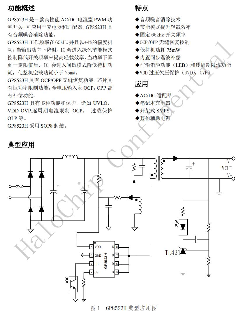 GP8523H是一款高性能AC/DC電流型PWM功率開關(guān),可應(yīng)用于充電器和適配器。GP8523H具有音頻噪音消除功能。GP8523H工作頻率在65kHz并且以±4%的幅度抖動(dòng),當(dāng)輸出功率下降時(shí),IC會(huì)進(jìn)入綠色節(jié)能模式控制降低開關(guān)頻率來提高輕載效率,當(dāng)功率下降到一定限值后,IC會(huì)進(jìn)入間歇模式降低待機(jī)功耗,使整機(jī)空載功耗小于75mW。