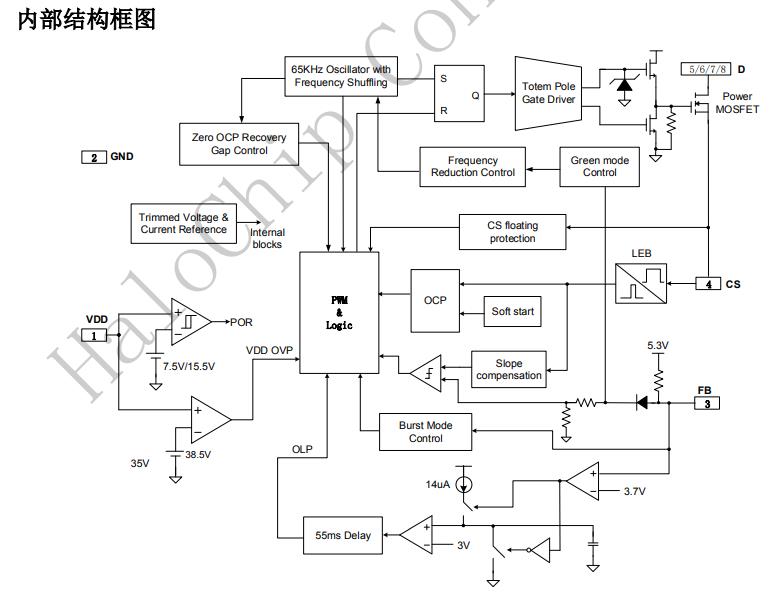 音頻噪音消除技術(shù)節(jié)能模式提升輕載效率固定65kHz開關(guān)頻率OCP/OPP無縫恢復(fù)控制低待機(jī)功耗75mW內(nèi)置同步諧波補(bǔ)償前沿消隱功能(LEB)和逐周期限流功能VDD過壓欠壓保護(hù)(UVLO,OVP