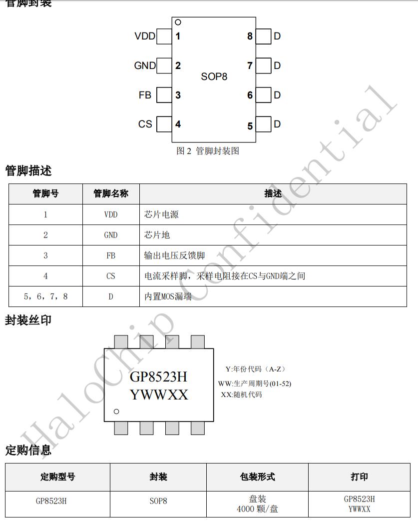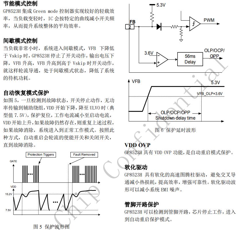 GP8523H具有多種功能和保護(hù),諸如UVLO,VDDOVP,逐周期電流限制OCP,過載保護(hù)OLP等。