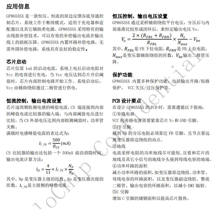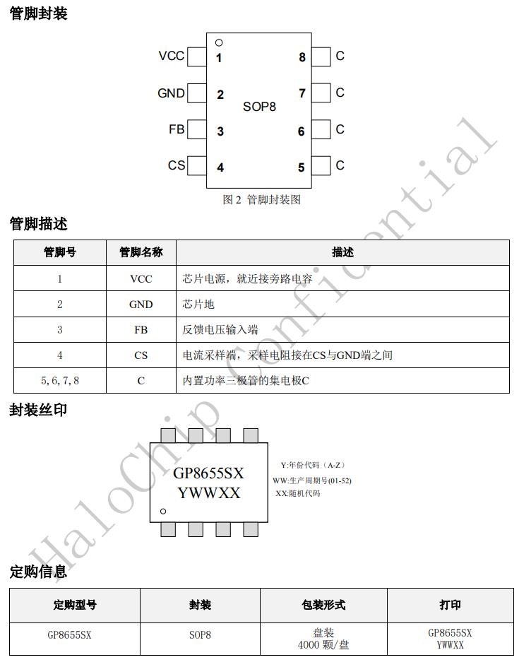 GP8655SX具有多重保護功能,包括開路保護,過壓保護,短路保護等功能。GP8655SX采用SOP8封裝