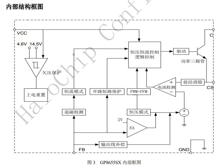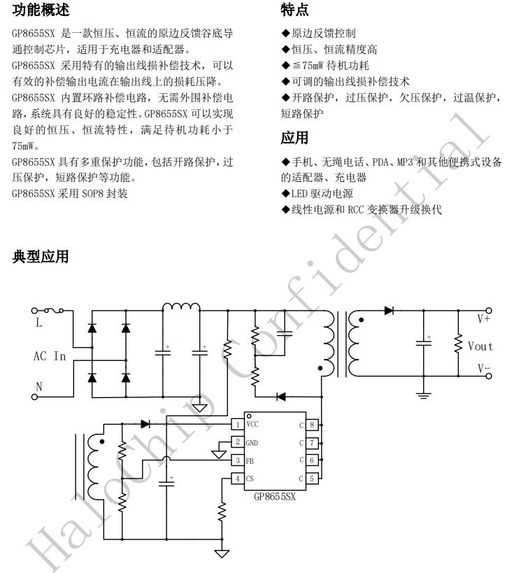 GP8655SX內置環路補償電路,無需外圍補償電路,系統具有良好的穩定性。GP8655SX可以實現良好的恒壓、恒流特性,滿足待機功耗小于75mW。