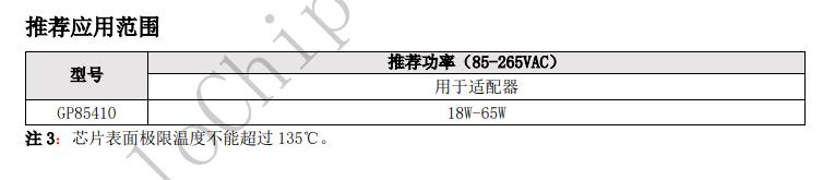 GP85410具有OCP/OPP無縫芯片具有OCP補償噪音消除技術,輸入電壓90VAC時重載無噪音。GP85410具有多種功能和保護,諸如UVLO,VDDOVP,逐周期電流限制OCP,管腳開路保護,OLP,RT腳短路保護等。