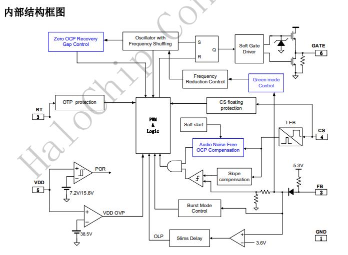 可編程OTP功能節能模式提升輕載效率最大65kHz開關頻率OCP/OPP無縫恢復控制低待機功耗75mW音頻噪音消除技術前沿消隱功能(LEB)和逐周期限流功能VDD過壓欠壓保護(UVLO,OVP管腳開路保護
