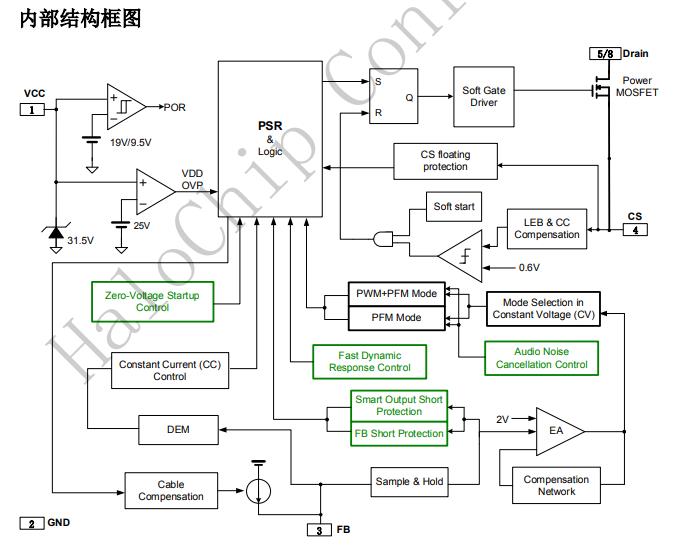 原邊采樣和反饋,無需光耦和TL431在常規輸入條件下,4%的恒流恒壓精度輸出線損補償技術超低待機功耗70mW音頻噪音消除技術前沿消隱功能(LEB)逐周期限流功能VCC過壓欠壓保護(UVLO,OVP)&鉗位管腳開路保護