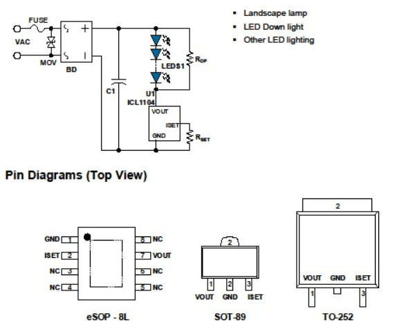 ICL1104 是一款單通道高壓線性 LED 恒流驅(qū) 動芯片,內(nèi)部集成 650V 高壓 MOS??赏ㄟ^外設(shè)電 阻對輸出電流進(jìn)行設(shè)置,電流可在 5mA~80mA 范 圍內(nèi)進(jìn)行任意調(diào)節(jié)。 ICL1104 內(nèi)置線性過溫保護(hù)功能,可以有效防 止系統(tǒng)溫度突變造成的損壞。 ICL1104 整個系統(tǒng)具有外圍簡單,應(yīng)用靈活, 可靠性高,體積小,系統(tǒng)成本低等優(yōu)點;合適的封 裝技術(shù)可應(yīng)用于各類 LED 燈具。