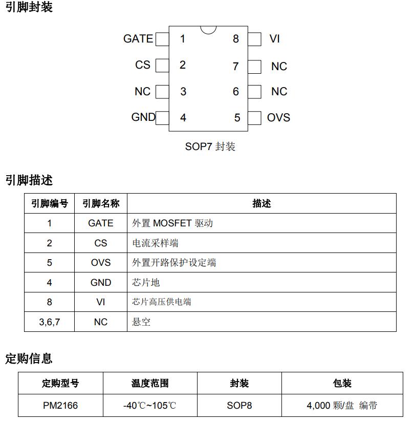 PM2166 采用專利的退磁檢測技術(shù)和高壓供電技 術(shù),無需 VCC 電容和啟動(dòng)電阻,使其外圍器件 更簡單,節(jié)約了系統(tǒng)的成本和體積。 PM2166 系列產(chǎn)品芯片帶有高精度的電流采樣電 路,同時(shí)采用了專利的恒流控制技術(shù),實(shí)現(xiàn)高精 度的 LED 恒流輸出和優(yōu)異的線電壓調(diào)整率。芯 片工作在電感電流臨界模式,輸出電流不隨電感 量和 LED 工作電壓的變化而變化,實(shí)現(xiàn)優(yōu)異的 負(fù)載調(diào)整率。