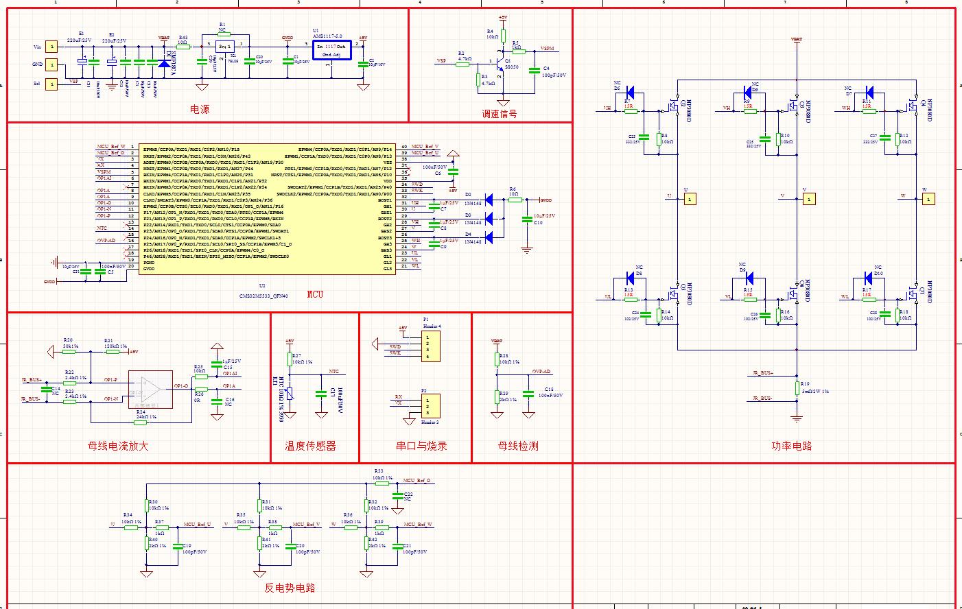 采用 0.005R 采樣電阻取得母線電流對應(yīng)的電壓信號,通過單片機內(nèi)置運算放大器放大 (放大倍數(shù)為 10 倍)。為了能得到準確的電流信息,增加偏置電路。偏置電壓由 R21、R22、R19 分壓后通過 CMS32M5533 內(nèi)部運算放大器產(chǎn)生。