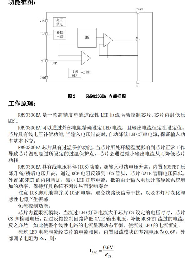 RM9033GEA 是一款高精度單通道 線性 LED 恒流驅動控制芯片,芯片內封 低壓 MOS,電流范圍(5mA-2000mA)。 RM9033GEA 可以通過外部電阻精 確設定 LED 電流,且輸出電流恒定在 設定值。芯片具有線電壓補償功能,當 輸入電壓過高時,自動降低 LED 燈串電 流,保證輸入功率基本不變。 RM9033GEA 芯片具有過溫保護功 能,當芯片所處環境溫度影響到芯片 正常工作導致芯片溫度超過所設定的 過溫保護點,芯片會通過減小輸出電 流從而降低芯片功耗。